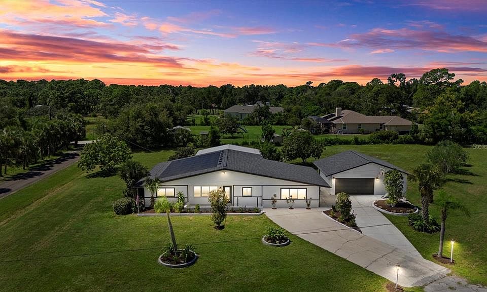 One or more photo(s) has been virtually staged. 1 ACRE OF LAND. NO HOA. 2022 ROOF. DETACHED GARAGE. 3 BEDROOM, 3 BATHROOM HOME. Welcome to your private retreat in the highly sought-after Mission Valley Estates, where country serenity meets coastal convenience. This beautiful 3-bedroom, 3-bathroom home sits on a full acre of land, offering the rare freedom to live life your way. With NO HOA, you can park your boat or RV right at home and still have plenty of space to build your dream pool, a detached casita, or an additional accessory dwelling, the possibilities are endless. From the moment you arrive, you’ll feel a sense of space and privacy that’s hard to find. The expansive yard and mature landscaping offer room for gardens, outdoor entertaining, or simply soaking in Florida’s sunshine and fresh breezes. The oversized DETACHED 2-car garage provides ample room for storage, a workshop, or your favorite hobbies. Inside, you’ll find a bright and open layout designed for both comfort and connection. The kitchen features white cabinetry, granite countertops, stainless steel appliances, and a large walk-in pantry. The great room impresses with vaulted ceilings, shiplap accents, and exposed beams creating the perfect gathering spot for friends and family. Sliding doors open to a spacious screened lanai, ideal for relaxing and entertaining while overlooking your private backyard oasis. The PRIMARY SUITE is a peaceful escape, complete with an UPDATED EN-SUITE bath and walk-in shower. Two additional bedrooms offer flexibility, one with its own PRIVATE ENTRANCE that’s perfect for a guest suite, in-law quarters, or HOME OFFICE. This home has solar shingles built into the roof, providing energy savings while protecting the house. Durable and low-maintenance, they are an efficient upgrade to the property. Located in the EQUESTRIAN-FRIENDLY Mission Valley Estates, this home delivers the best of both worlds: quiet country living and unbeatable convenience. You’re just minutes to Nokomis Beach and Casey Key, close to Legacy Trail for walking or biking, and within easy reach of US-41, I-75, and Sarasota Memorial’s Venice campus, making daily life and weekend adventures effortless. There are also multiple Publix stores close by. Here, you can live without limits, with the freedom to expand, build, and enjoy the Florida lifestyle exactly as you’ve envisioned. Excellent SCHOOL ZONING! This home is in the Laurel Nokomis K-8 and VENICE HIGH SCHOOL, and just minutes from Pine View School for the Gifted. Copy and paste the following link for a luxury video: https://player.vimeo.com/video/1122845541?badge=0&autopause=0&player_id=0&app_id=58479%2Fembed