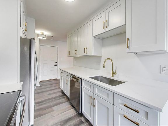 This beautifully modern first-floor condo features 2 bedrooms and 2 bathrooms, offering the perfect combination of sophisticated style, ample storage, and the prime location. The unit is the definition of move-in, refinished in 2025, featuring brand-new windows, sliding doors and an updated kitchen and bathrooms. The expansive primary suite serves as your personal oasis, featuring a spacious walk-in closet and an en-suite bathroom that boasts a walk-in shower, smart mirror, and luxurious tiling. If you're looking for a spa-like experience, utilize the 2nd bathroom, perfect for a soak in the tub. The refinished kitchen is a highlight, equipped with brand-new stainless-steel appliances, sleek quartz countertops, and shaker cabinets, highlighted with stylish gold accents. Enjoy the generous light that pours through the new windows throughout and the double sliders in the open-concept living and dining area, creating an inviting space for both relaxation and entertaining. Additional features include parking and dedicated storage locker. Take advantage of the community amenities, which include on-site laundry, refreshing pool and a party room perfect for hosting gatherings. This home is ideally situated just moments from the tranquil Old Orchard Golf Course and the bustling Randhurst Shopping District, offering easy access to dining, shopping, and leisure activities. Seize the opportunity to own this elegantly appointed, fully rehabbed condo while you can!