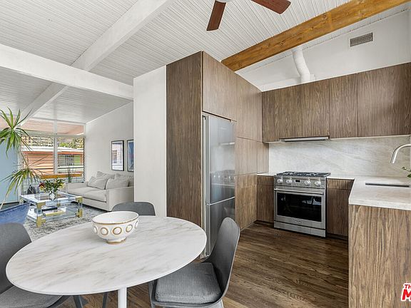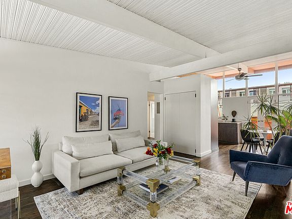 The iconic Hollywood Riviera is a celebrated West Hollywood landmark, designed in 1954 and embodying the quintessential mid-century Los Angeles aesthetic. Featured in publications such as Dwell and Architect Magazine, the building holds a coveted Mills Act historic designation, offering substantial property tax savings for its next owner. A recently completed renovation included earthquake retrofitting and a meticulous restoration of the common areas, returning the property to its original splendor. Residents now enjoy a resort-style pool with an expansive deck framed by lush tropical landscaping. This south-facing, upper-level residence showcases dramatic architectural elements, including vaulted ceilings, exposed beams, and floor-to-ceiling windows that bathe the interiors in natural light. Thoughtfully updated, the home blends authentic character with refined modern finishes. The kitchen is appointed with all-new custom cabinetry and appliances, Taj Mahal quartzite countertops, and clerestory windows. A renovated bathroom features a soaking tub, contemporary vanity, illuminated medicine cabinet, and upgraded plumbing. Additional highlights include a newer HVAC system, generous in-unit storage, and a private balcony spanning the length of the residence. Secure, automated gated entry provides two covered parking space, a rare amenity in the neighborhood, along with additional garage storage. The building also offers on-site laundry, controlled access, and earthquake insurance. Steeped in Hollywood history and often seen in film, television, and commercial productions, the Riviera remains one of West Hollywood's most enduring architectural treasures. Perfectly situated moments from the Sunset Strip's world-class dining, shopping, and nightlife, this residence offers the ultimate expression of California living.