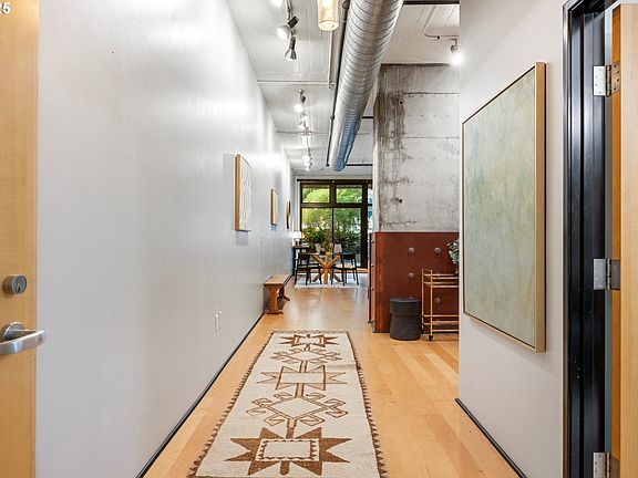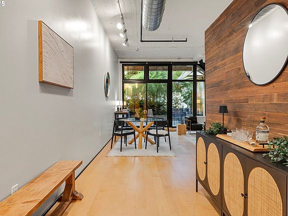 Stylish condo blends industrial character with contemporary comfort. Gorgeous hardwood floors, soaring ceilings, and a dramatic floor-to-ceiling window fill the space with light and open to a private 300-square-foot patio, ideal for entertaining or relaxing under the city sky. The bedroom’s reclaimed old-growth hardwood detailing adds warmth and craftsmanship, while the 2024 bathroom renovation impresses with a custom vanity, abundant storage, Calacatta marble folding station with drying rack, newer washer and dryer and custom-tiled bath surround that makes the most of every inch. Deeded parking and a spacious storage unit complete the package. Ask your agent about kitchen tile backsplash and Blazer ticket incentive! Damian Lillard is back, and so is your chance to live stylishly in the heart of the Pearl! Scoot, bike, walk, ride to shopping, and all the best of city life—this is Portland living at its finest.