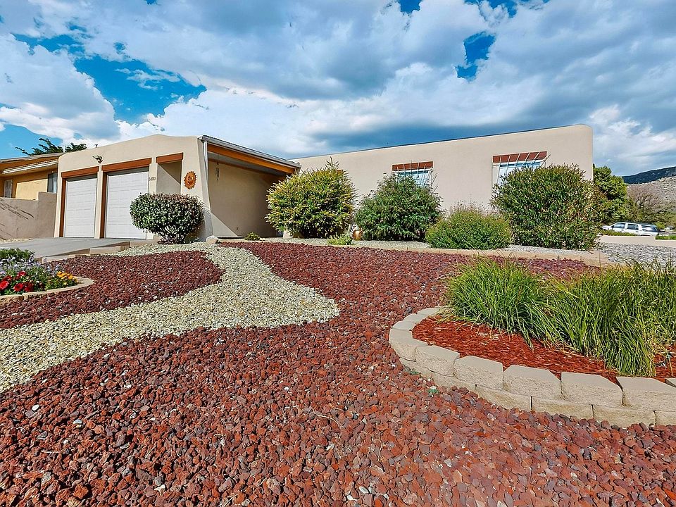 Your Search Ends Here! Discover this stunning, impeccably maintained home located just steps from the scenic Embudo Canyon. Pride of ownership shines throughout this beautifully upgraded residence, nestled on a spacious corner lot with low-maintenance, professionally landscaped front and back! Step inside to find stylish flooring, an updated kitchen, and modern bathrooms that offer both comfort and elegance. The oversized, finished two-car garage includes a workshop area perfect for hobbies or extra storage. Enjoy the outdoors year-round with a cozy covered patio and durable synthetic stucco exterior.Additional highlights include a full sprinkler system, upgraded electrical wiring, and thoughtful improvements throughout. Ideally situated just east of Tramway with quick access to I-40