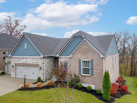 Like-new ranch home in popular Saratoga Springs at Triple Crown Country Club. This home offers convenient one-level living with an open arrangement of the large family room, spectacular kitchen with generous island and walk-in pantry, and a spacious dining area. A covered outdoor living space with TREX decking and stone fireplace lets you relax and enjoy the outdoors. A secluded first floor primary suite includes a luxurious bath and large walk-in closet. A separate wing off the main foyer includes a bedroom, home office, full bath and laundry room. The finished lower level features a recreation room, den/3rd bedroom and a full bath. Central vacuum system, 3-car front entry garage and irrigation system.
