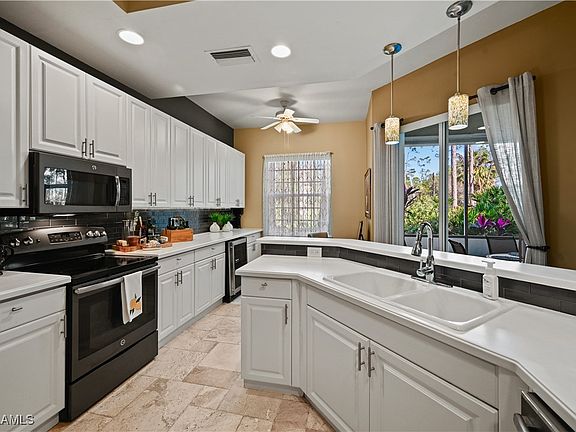 First-floor condo with no stairs, providing easy, step-free living. This beautifully maintained 2-bedroom, 2-bathroom condo with a den offers a spacious and open-concept layout perfect for entertaining.The Den is set up as a bedroom providing a third sleeping space for guests. The large kitchen is a chef's dream, featuring ample counter space for meal prep, a wine cooler, plus plenty of storage. The condo comes partially furnished, making it easy to move right in and enjoy the comfortable living spaces. Step outside to your private lanai—an ideal spot to enjoy your morning coffee or unwind with a glass of wine as you take in the serene surroundings. The property also includes a 1-car garage for convenience and extra storage. This condo has never had any flooding from the previous storms, always stayed dry and damage free. This pet-friendly condo is perfect for you and your pets to enjoy. The vibrant community offers a variety of fantastic amenities including 2 pools, a fully equipped workout room, basketball court, playground, and a clubhouse that hosts frequent social events. For sports enthusiasts, a brand new sports court for tennis and pickleball is ready for action. Location is key—this condo is just minutes from RSW Airport, numerous golf courses, and the Minnesota Twins and Boston Red Sox Spring Training facilities. Whether you're looking for relaxation, recreation, or a lively social atmosphere, this home offers the perfect combination.
