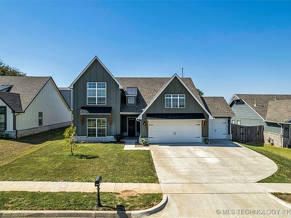 Fabulous 4-bedroom, 3-bath home built in 2021 and offering an incredible 2.75% VA assumable loan opportunity! Located in the coveted Glen Hills neighborhood, this stunning home includes a refrigerator, washer, and dryer. Enjoy serene ponds, scenic walking trails, a splash pad, and a playground just steps from your door. The thoughtfully designed layout includes a spacious Kitchen with a large island that seamlessly flows into the Living Room and Dining area, making it perfect for entertaining. The main level features a generous Primary Suite with a private Bathroom, complete with a double vanity and a large walk-in closet, providing a peaceful retreat. Additionally, there is a versatile bedroom that can serve as an office, along with a full bathroom. Upstairs, you will find two more bedrooms, a flexible loft or game room, and another bathroom. The covered back porch is ideal for relaxing or hosting guests. It is conveniently situated near the South County Recreation Center and the Tulsa Outlet Mall, making shopping and dining easily accessible for a convenient lifestyle.