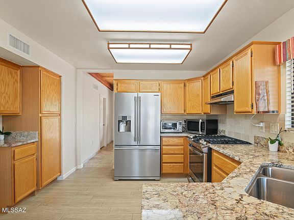 Property Description - Stylish Southwest Retreat with Modern Upgrades! Enter into this beautifully updated 2BR/2BA townhouse, where Southwest style meets contemporary convenience. From the warm wood ceilings to the extended faux-flagstone patio, every detail has been thoughtfully designed for comfort and long-term enjoyment. Inside, enjoy dual-pane Pella windows, tile flooring throughout (no carpet!), granite kitchen and bathroom countertops, updated vanities, and sleek stainless-steel appliances. This private escape also boasts a fully upgraded HVAC system, repaired ductwork, new hot water heater, ceiling fans, and charming plantation shutters throughout. Both bathrooms have been remodeled with walk-in tiled showers (no tubs), and the home offers extra storage with additional cabinets in in the laundry and garage, plus a spacious linen closet. Outside gives you a cozy back patio framed by natural desert vegetation and a peek at the Catalina Mountains - perfect for winter sunsets or morning coffee. The HOA takes care of front landscaping, termites, roof, exterior paint, trash, and access to an amenity-rich recreation area. With active community groups and a prime location near Sun City's main activities, this home is your ideal year-round retreat or winter haven!