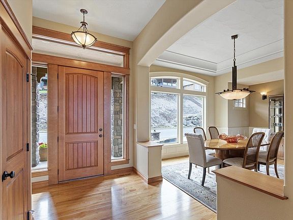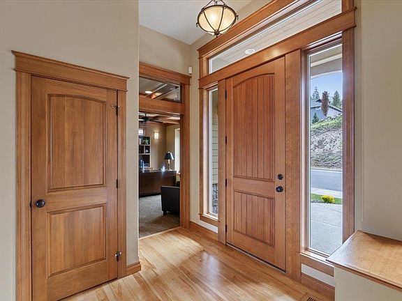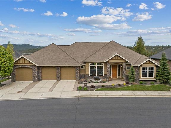 Unobstructed golf course and mountain views greet you from the expansive windows and covered deck of this spectacular one-owner custom home in the exclusive Wandermere Estates, a gated 55+ community in North Spokane. High-end quality + craftsmanship throughout. As you enter, you'll find the open- concept great room, dining & kitchen, gorgeous wood floors, extensive woodwork, beams and built-in cabinetry + box beam ceilings in office. Cook's kitchen features, high-end SS appliances, gas cooktop, double ovens, granite counters + a 9 foot island. Primary suite boasts a spa-like bathroom + access to the covered deck. Downstairs is full daylight with a family room, spacious guest suite and a large kitchenette. Perfect for multigenerational living or mother-in-law. Additional space to finish to meet your needs + enormous storage room. Zero-step entry into the home + wide doorways throughout. Golf course living at its best! Enjoy dining at the club house too.