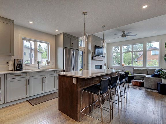 Stunning mountain triplex in the heart of Canmore. Perfectly positioned a short walk from downtown Canmore, this beautifully designed home spans three spacious levels and offers an exceptional blend of style, comfort and functionality. The main floor boasts an open-concept layout featuring a modern kitchen, dining area and living room with vaulted ceilings and a striking fireplace as the centrepiece. Step out onto the expansive deck to take in breathtaking mountain views. This level also includes two well-appointed bedrooms and a full bath. Upstairs, the private primary suite offers a luxurious retreat complete with a spa-inspired ensuite, walk-in closet and convenient laundry area. The fully finished lower level offers flexibility and is ideal for guests or roommates, featuring a large family room, a kitchenette, an additional bedroom and another full bathroom. Additional highlights include attached garage, ample storage and premium finishes throughout—engineered hardwood floors, stainless steel appliances and quartz countertops.