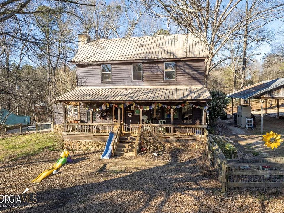 This beautiful 1900s historic home has a unique history and is situated on a beautiful 10 acre lot with a pond, outbuildings and a horse barn. The interior features a rustic wood stove, wide plank antique pine floors, ship lap walls and bead board ceiling, giving it a cozy, traditional feel. The open country kitchen is a great feature and the main level has a recently renovated full bathroom, adding a touch of modern. With two additional bedrooms, one with a private full bathroom, and an attic room that could be used as an office or bedroom, this home an abundance of space. Plus, the new HVAC upstairs will keep everyone comfortable year-round. This stunning property is a must-see! The exterior of the home features a covered front and back porch, a brand new in-ground pool, two yurts, a greenhouse and storage with building supplies, there is something for everyone to enjoy. Plus, the guest house, partially restored, will make a great addition to the property. Don't miss this incredible opportunity!It really is an idyllic property and perfect for anyone looking for a unique, historic home with plenty of outdoor space for horses or livestock.