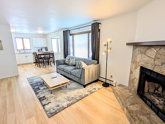Large corner decorative fireplaceDining tableLarge closetsSpacious freshly renovated kitchenTwo spacious bedroomsBrand new cabinets