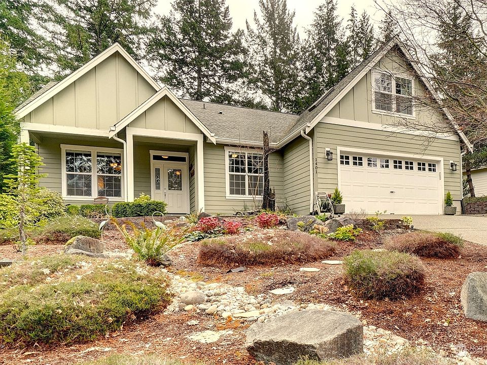 Beautiful Custom Home on Lakeland Village Golf Course! Fall in love with the gorgeously landscaped grounds w/ stone terraces, garden beds, garden shed, and a wide variety of plants/flowers/berries/trees! This welcoming open concept floor plan features vaulted ceilings, hardwood floors, spacious kitchen, inviting living room w/ fireplace, ultraviolet HVAC system, new window blinds, recirculating hot water system, spacious primary suite, 2 guest rooms and more! Lives like a single level w/ huge bonus room & full bath upstairs. Relax & watch the golfers from the covered patio year-round! Lakeland Village offers a PGA golf course, lake w/ community beach, playground, tennis/pickleball & restaurant! Welcome Home!