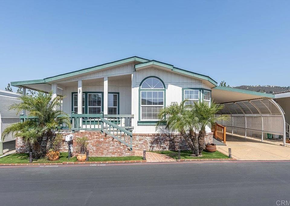 Own your own land & home! No space rent or land lease! 55+ resident owned community! Home has a recorded 433A and therefore qualifies for Fannie Mae, FHA, Reverse Mortgage, and VA financing! Handicap friendly ramp for easy access. This home boasts an open floorplan with lots of natural light! Big Island Kitchen with cheerful breakfast nook area and large pantry with pull out shelves. A formal Dining room is open to a great room style Living room. Two guest bedrooms, one features a murphy bed. Ceilings fans in every room plus lots of solar tubes / skylight for plenty of natural light! The Primary Suite offers a big walk in closet and double sinks. The laundry room features a deep sink and extra storage space. The exterior boats an extra wide carport with privacy screen and stamped concrete, a storage shed, and a lovely wrap around covered deck for relaxing and entertaining. All appliances are included "as is." Madrid Manor is a resident owned, 55+ community w/ a low monthly HOA fee of $222 and plenty of social activities for those seeking an active lifestyle with numerous amenities that include a clubhouse, a Waterfall connecting two ponds and landscaped with walking and hiking trails; pool/spa, BBQ area, tennis/pickle ball courts, ping pong, putting greens, billiard room, card room, library, gym, shuffleboard, korn-hole, car wash area, a studio for dance classes and small meetings, plus a large RV lot for vehicles/boats/trailers and more! Located close to shops on El Norte, as well as Costco, Walmart and Kohls on Nordahl.