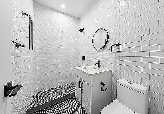 The spacious bedroom easily fits a queen-size bed and additional furniture, and includes a generous double-door closet for ample storage. The bathroom is finished with beige tiling, a contemporary vanity mirror, and under-sink cabinetry for added functionality.