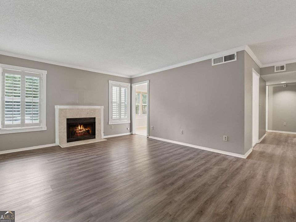 BEST LOCATION IN COMPLEX! Beautiful Granite C/Ts w/New Brushed Nickel Faucets, Stainless Steel Applicances throughout Kitchen w/ New Tile Flooring, Tile Backsplash, & New Maple Cabinets. Georgous Travertine Tile Fireplace in Living Room w/Crown Moulding, New Berber Carpet, & Hardwood Floors in Foyer. Plantation shutters in breakfast area & living room for privacy.Granite c/t in master & guest bathrooms w/tile flooring & new brushed nickel faucets. Reglazed & resealed tub in master/guest bathrooms. Beautiful Pond steps away. Convenient to Perimeter Mall & City Walk.
