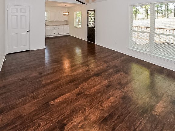 Step inside to a bright living room featuring hard-surface flooring that runs throughout the home, creating a seamless and low-maintenance flow. Tall ceilings with exposed beams add a touch of character, while large windows fill the space with natural light.
