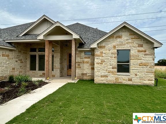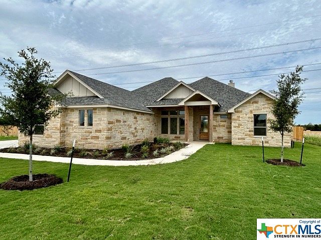 A stunning rock and brick home located in Flint Ridge Estates! This 4 bedroom 2 1/2 bath features luxury vinyl plank in all main living areas, tile in the wet areas, and carpet in the bedrooms. Quartz counter tops, high ceilings, crown molding, and coffered ceilings offer the finishing touches you will appreciate. The primary bathroom offers an incredible double walk in shower with dual shower heads and a soaking tub. Just what you need after a long day! Situated on 1/2 acre in Salado I.S.D. Huge Buyer incentives. Up to 3% in buyer paid closing costs!