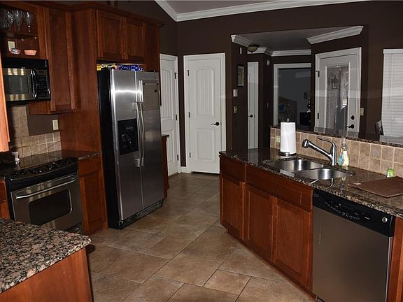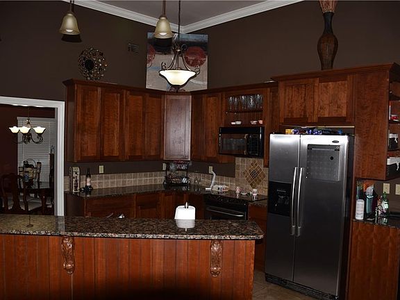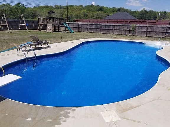 Fantastic Four bedrooms, three full baths, granite throughout, twelve foot living room ceiling with fireplace, dining room, large utility room plus eat-in-kitchen. Home features a bonus safe room. Beautiful covered front porch and fantastic back patio area with fireplace, great for entertaining. New in-ground pool with diving board, 16 x 20 outbuilding, plus kids swing set and fort. A definite must see!