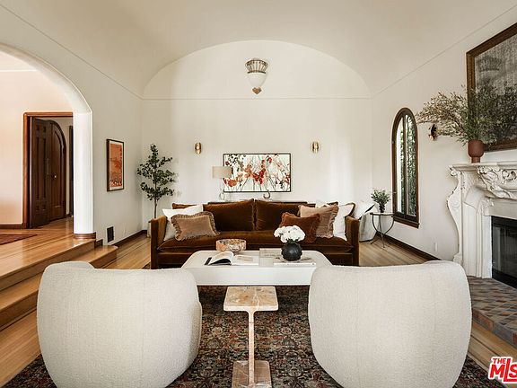 Timeless allure awaits you in this magnificent 1928 Spanish-style residence. Perched above the street, this masterpiece was crafted by the finest artisans of its time and has been meticulously restored to its former glory, with exquisite designer updates. Every corner of this residence exudes sophistication and craftsmanship, from the elegant, rounded wood moldings and ornate hardwood floors to moody Farrow and Ball wallpaper and seductive vintage Murano glass light fixtures. The step-down living room, with its high barrel-vault ceiling and an ornate fireplace, is the heart of the home, providing the perfect space to entertain while offering beautiful views of the lush hillside surroundings. Indulge your culinary desires in the elegantly designed chef's kitchen with an extraordinary 19' Calacatta marble floating shelf and backsplash, luxe Danish cabinetry, Perrin & Rowe brass fixtures, and high-end appliances including a Gaggenau range, Bertazzoni oven, and paneled refrigerator and dishwasher. Spend mornings in the sun-filled rotunda breakfast room and evenings at the built-in mirrored bar that will be the envy of all your friends. The wide atrium hallway, with in-lay cabinetry and oval skylight, leads to four spacious bedrooms, each with high coved ceilings. Both ensuite baths feature lilac marble and porcelain tile; the extraordinary hall bath was renovated to open into a separate shower with original skylight overhead. Enjoy dinner al fresco on the expansive front deck overlooking silhouettes of the palm trees that line the neighborhood, or walk the secret stairs to LAMILL, Botanica, or L&E Oyster and return to a restful backyard with outdoor shower. Meticulous updates include upgraded electrical and copper plumbing, CAT-5 wiring, rebuilt fireplace, and much more. Thoughtfulness and glamour are woven into every aspect of this home so that you, as the fortunate buyer, can simply relax and revel in the splendor of this impressive residence.