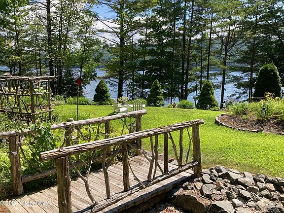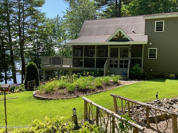 HIGHEST & BEST offers by 5pm Tue 4/18. Beautiful 5 BR, year round lake home w/ 155' of shoreline & stunning landscaping. Everything you want in a lake-escape is right here - Gorgeous lake & mountain views, lots of bedrooms & baths for all your visitors (1st floor Master if it's just you!) large deck plus screened porch, terraced custom landscaping includes stone walls, bridge, gardens & firepit, surrounded by beautiful Adirondack forest. Unique stone landing on the shoreline provides direct lakeside seating! Home features a cozy wood burning stove w/stone surround, vaulted wood ceilings, loft with lake views for secondary living space, back up propane Generator, 2 car garage. Upstairs, separate heating zone. Lawn has an irrigation system. Furnishings not included but can be negotiated.