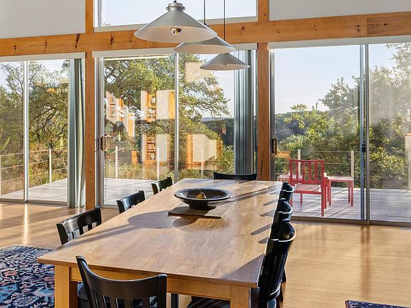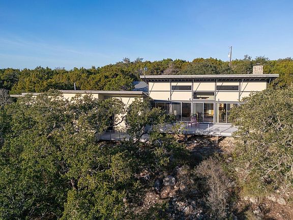 RED HAWK ROAD MID-CENTURY MODERN RETREAT — A prestigious hill country haven, located on a private road, designed by Architect Lou Kimball. Enjoy peaceful, unobstructed views of rolling hills, trees, and the valley beyond. Take in the morning sunrise from the spacious back deck. The desirable split floor plan offers privacy for guests, while the primary suite includes a screened porch for relaxing outdoor living. Tall windows and doors throughout the home fill every room with natural light. Fenced courtyards feature native plantings, wildflowers, and a raised herb garden. The property also includes two 10,000-gallon rainwater collection tanks with a filtration system, and an easy-to-manage wildlife exemption. Majority of furniture negotiable for quick availability. Close to Schools, Restaurants - Medical in Wimberley, Kyle and San Marcos. Approximately 7.5 Miles from Wimberley Square, HEB and the Library. All information is deemed reliable but not guaranteed. Buyers and Agents are encouraged to verify details.