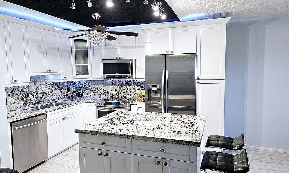 Features include hurricane-impact tinted windows, four remote-controlled ceiling fans, LED decorative timed lighting, and a complete remodel encompassing a new kitchen and bathrooms, an enclosed balcony with impact windows, an added second walk-in closet, roof attic storage, and a newer AC system. Additional features are keyless main door entry, a luxurious spa shower panel, low-flow toilets, a Bluetooth bathroom speaker/light fixture, a tankless water heater, and a whole-house water filtration system. Porcelain tile flooring is throughout.