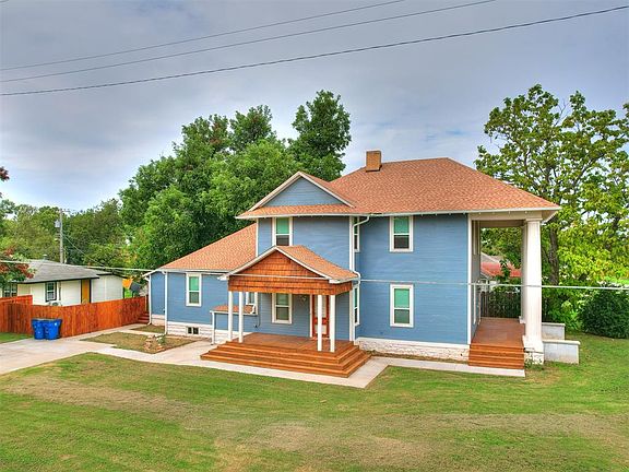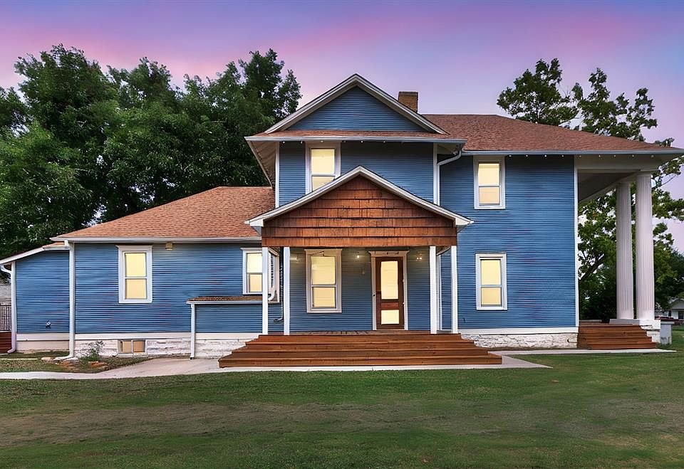 This absolutely stunning home has been carefully restored with modern finishes while preserving the timeless character that makes it truly one of a kind. Thoughtfully updated with all new PEX plumbing, electric, a 50-year composition shingle roof, Low-E windows throughout, and a tankless water heater, this home blends the charm of the early 1900s with today’s modern comforts. Inside, you’ll fall in love with the 10” baseboards, vintage hardware, and beautifully restored pine floors that tell a story of years past. Showcased on the Chickasha Tour of Homes during the holiday season, this property radiates warmth, character, and style. The striking triangular-shaped fireplace serves as the centerpiece, offering cozy ambiance from the living room, dining room, and primary suite. A grand staircase greets you at the entry, while oversized pocket doors welcome you into the dining area. The kitchen is a true showstopper, featuring quartz countertops, new cabinetry, and included appliances, all framed by an abundance of natural light.