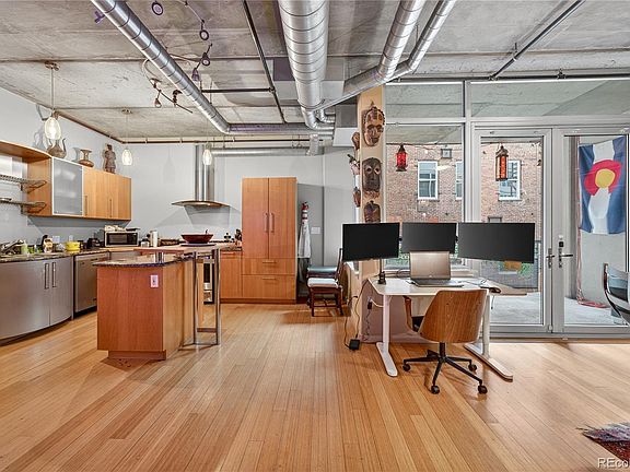 Denver city living at its finest in the highly desirable Waterside Lofts—where modern style meets the best of urban convenience. This all-concrete-and-steel building offers the perfect balance of sophistication, comfort, and durability, ideal for both entertaining and quiet relaxation. Industrial-inspired design features include exposed air ducts, piping, and concrete ceilings, complemented by sleek hardwood floors. The expansive living area is highlighted by oversized windows and a door leading to a private balcony, filling the space with natural light and offering a seamless indoor-outdoor flow. The modern eat-in kitchen is a true centerpiece, featuring granite countertops, a center island with built-in bar-height seating, and a large window for added light. All appliances have been replaced with high-quality stainless steel or reliable upgraded models, ensuring both style and function. Each of the two spacious bedrooms offers plenty of storage, while the primary has a private en-suite bath.The in-unit laundry adds to the effortless lifestyle this home delivers. Waterside Lofts is known for its active community and responsibly managed HOA, complete with a social committee and top-tier amenities including a 24-hour front desk concierge and a state-of-the-art fitness center. Two reserved, secure garage parking spaces add peace of mind. Step outside to the Cherry Creek bike path and enjoy easy access to REI, shops, and dining. Walk to Coors Field, Ball Arena, Whole Foods, 16th Street Mall, and some of Denver’s finest restaurants and nightlife—this is true downtown living at its best.