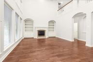 Gas fireplaceHome officeWood flooringRecessed lightingCeramic electric cooktopWall of windowsFormal dining room