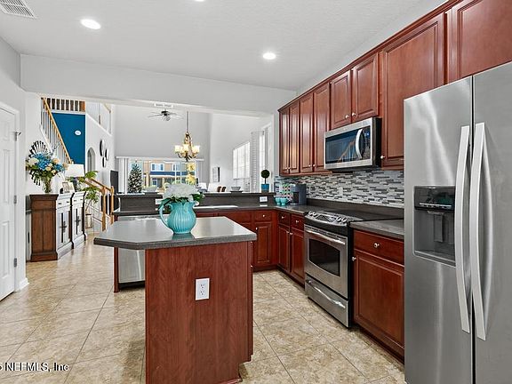 Step inside this bright and inviting 2,369 sq ft residence and feel instantly at home. Built with durable concrete block construction on the first floor, this home combines solid craftsmanship with peace of mind. Soaring tall ceilings and large tile flooring throughout the main living areas create an open, airy atmosphere that's both elegant and easy to maintain. The spacious, well-appointed kitchen is a chef's delight, featuring gleaming stainless steel appliances, a convenient center convenient center island, and durable Corian countertops perfect for everyday meals or entertaining.