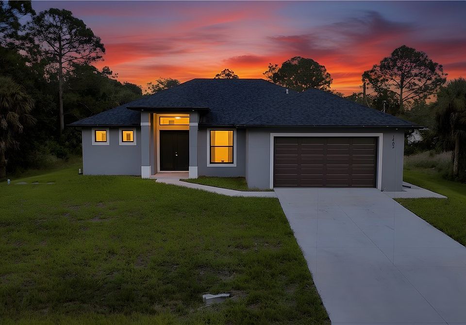 Beautiful new construction home on a half-acre lot with mature palm trees and plenty of outdoor space. Featuring 3 bedrooms, 2 bathrooms, and a 2-car garage, this open-concept floor plan offers high ceilings, modern finishes, and abundant natural light. The master suite provides a private retreat, while the split-bedroom design ensures comfort and privacy. Located in a peaceful area of Lehigh Acres, close to shopping, dining, and major roadways.