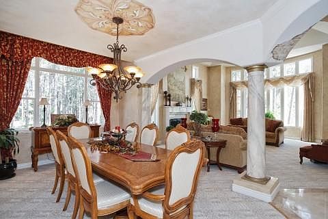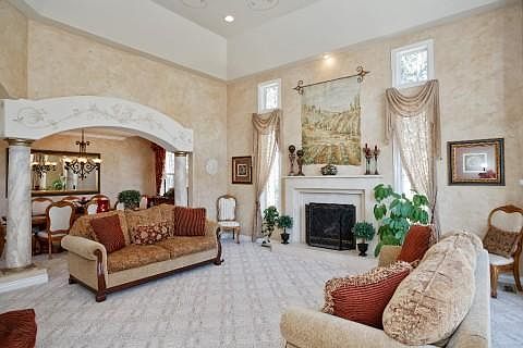 Features include: marble entry with grand curved staircase hand troweled walls 14 ft ceilings formal living room with beautiful fireplace columns lead into the spacious theme based formal living and dining room, main level office, gourmet kitchen with maple cabinets, center island slab, granite counters, gas cook top, large eat-in nook, walkout to Trex deck with stucco wall hardwood floors in kitchen that opens to great room with fireplace and expansive windows to soak in the sun.