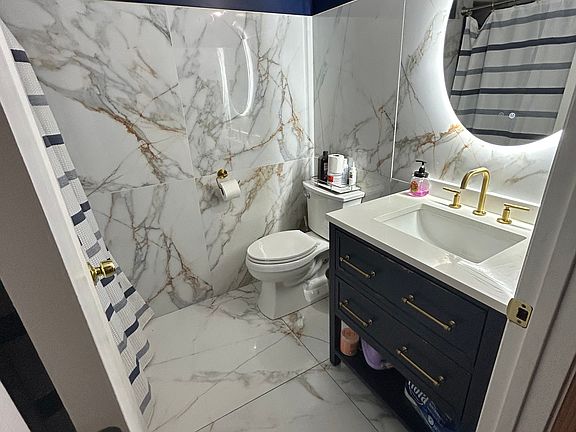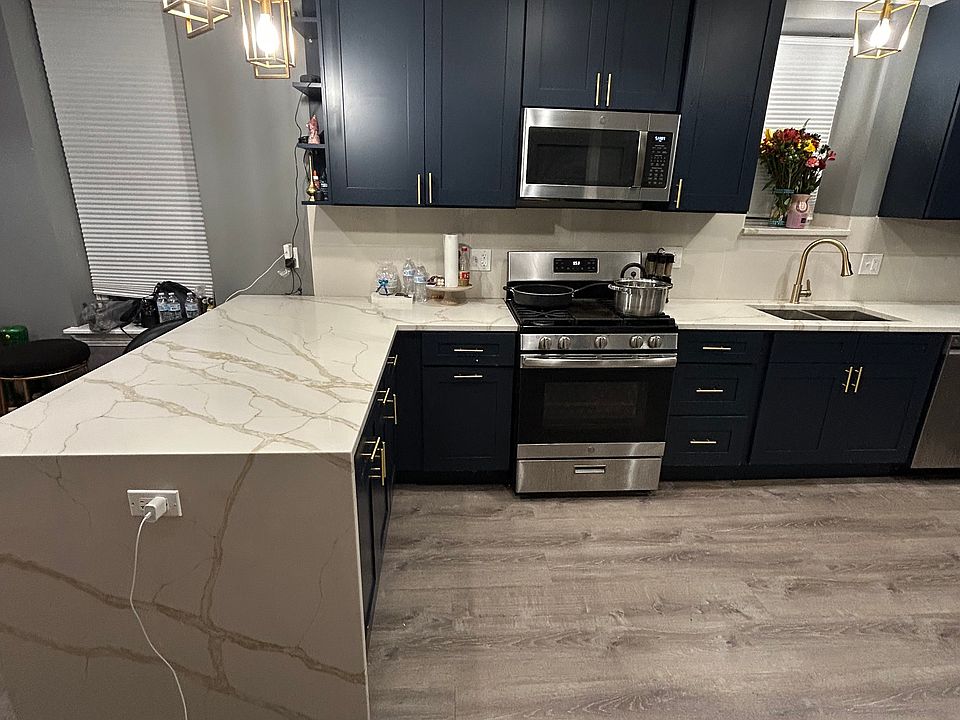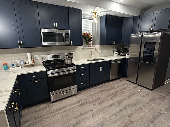 The kitchen includes modern shaker cabinets, quartz countertops, and stainless steel appliances, perfect for cooking and entertaining. There's also an in-unit laundry hookup ready for your washer and dryer.