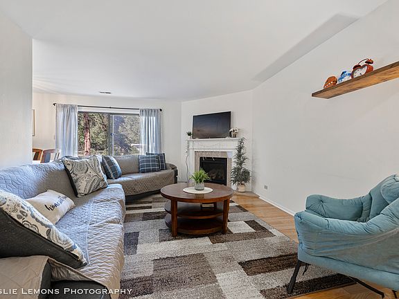 Rare first-floor unit in Briarcliffe Knoll Condos, located on a quiet cul-de-sac in South Wheaton. Close to Wheaton Park District, College of DuPage, shopping, and highways. This 2-bedroom, 1-bath home features an open floor plan with a spacious living room with a gas fireplace, dining room with sliding glass doors to a private patio, and an eat-in kitchen with appliances. It has hardwood flooring, in-unit laundry with full-size washer and dryer, and a master suite with a private vanity, walk-in closet, and shared bath. Additional storage is available on the patio and in the garage, with easy garage access.