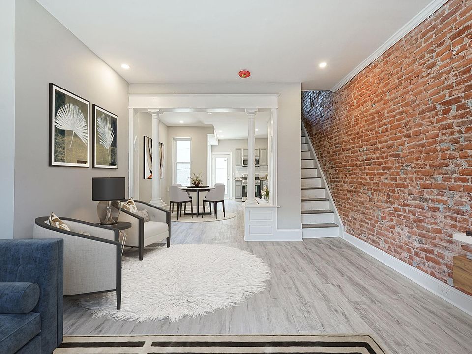 Enter into the open living room complete with exposed brick, luxury flooring and recessed lighting. Continue into the bright and airy kitchen featuring energy efficient stainless steel appliances, gas range, quartz countertop with island. Exit the rear of the house to a cozy private backyard, perfect for grilling, relaxing and growing your own herbs during spring and summer! Heading upstairs you will find 2 bedrooms and 1 large full bathroom including a double sink vanity The house also has plenty of storage space in the basement as well a Washer/Dryer included!