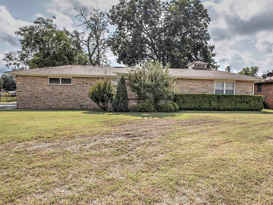 CUSTOM KITCHEN, COZY FAMILY ROOM & CONVENIENT LOCATION! This GEM combines Functionality, Comfort & Outdoor Enjoyment on a CORNER LOT! The family room is adorned w/ a picture window in the front & sliding glass door in the back that opens onto the East facing patio which has a rock border on one side. The thoughtfully designed CUSTOM KITCHEN incorporates beauty & style. Meal prep will be a snap w/ a GE electric oven & smooth top stove, KitchenAid Dishwasher, Stainless Steel Sink, Lazy Susan, Breakfast Bar & Solid Oak Cabinets GALORE! The 2 guest bedrooms are LARGE (16 X12 & 16 X 10) both sporting DOUBLE CLOSETS! The primary suite is 16 X 12 & includes an abundance of natural light & tiled shower! The garage is oversized to include a wall of cabinets & worktable. Outdoor living features a concrete patio, fenced back yard, mature trees & storage building. The rock exterior, vinyl/metal trim & gutters reduce your maintenance time! New shingles installed 6/2020! Call Ron today @ 580-467-1281 for your personal tour!