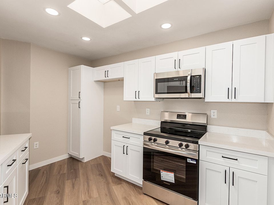 Discover all the charm of this lovely 3-bedroom townhome in the highly popular Sun City! Inside, you'll find inviting living spaces featuring wood-look flooring, vaulted ceilings to add a feeling of openness, skylights, and a neutral palette that compliments any style of decor. Whip up your signature dishes in the pristine culinary space, equipped with recessed lighting, shaker-style cabinets, quartz countertops & stainless steel appliances. The main bedroom is a true retreat, showcasing carpet for added comfort, a closet & a bathroom for privacy. The backyard is complete with a covered patio where you can enjoy your morning brew, weekend grills & cheerful evenings. This vibrant adult community's features include a sparkling pool, clubhouse, and spa. Check it out before it's too late!
