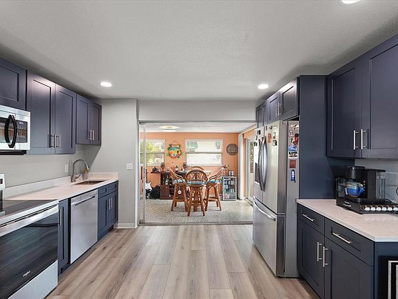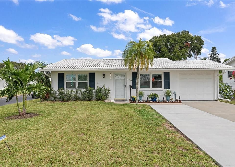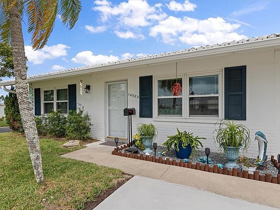 Move right in and start enjoying this fully updated home, perfectly situated in a sought-after 55+ golf cart–friendly community. Every detail has been thoughtfully upgraded, offering modern style, comfort, and peace of mind. Step inside to find a stunning kitchen with shaker-style blue soft close cabinetry, quartz countertops, recessed lighting, and stainless steel appliances. The open layout flows with new luxury vinyl plank flooring throughout, fresh interior paint, and newer windows that brighten every space. This home also features a new flat roof, stackable washer and dryer, and all new light fixtures, outlets, and switches. The exterior shines with new fixtures, a double driveway for plenty of parking, and gorgeous professional landscaping. Fully finished Florida room with beautiful terrazzo flooring offers additional living space for entertaining, or office. Relax on your private patio just off the Florida room or enjoy the comfort of a new AC system with LED blue light purification. Low maintenance fee of $240 covers water, sewage, garbage, grounds, community pool and clubhouse and exterior painting. Active community with clubhouse, heated pool and offers a full calendar of events! With everything move-in ready and beautifully finished, this home offers the perfect blend of modern upgrades and community living. No flood zone, close to beaches, shopping, restaurants and much more!