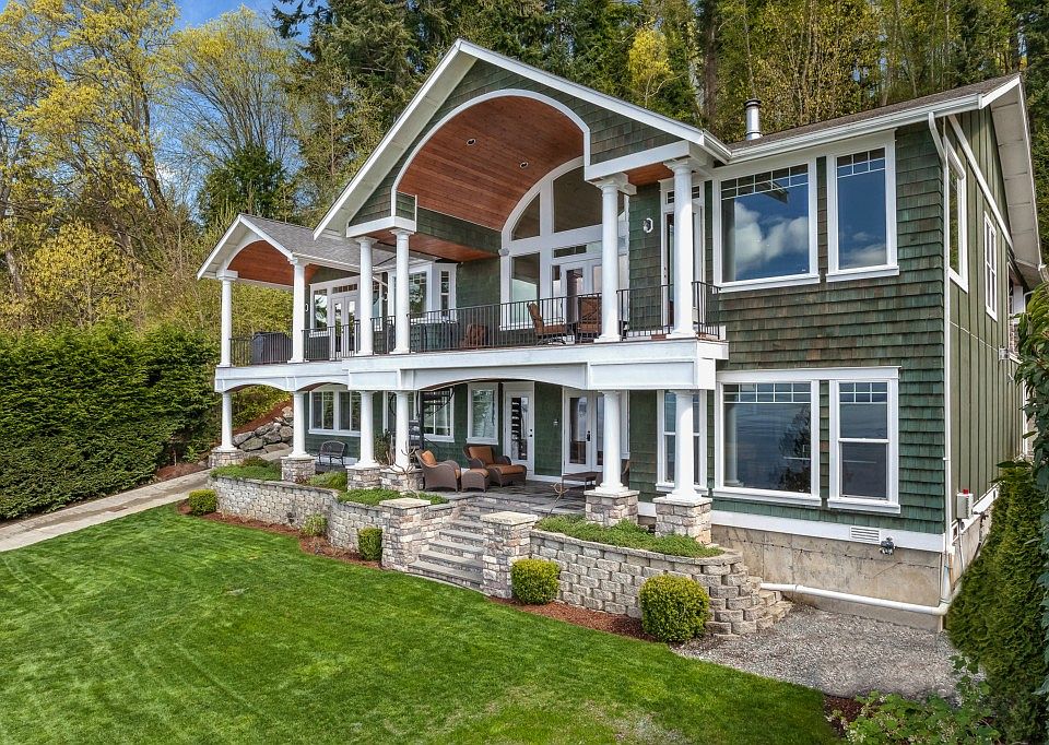 An architectural showcase surrounded by breathtaking 180 degree unobstructed Sound views. Custom-built in 2006 & perched high on a hill, this spacious but livable 4,768 sqft home features rare master on main floor + additional bed. Dramatic but elegant flr plan designed to maximize view. Downstairs features big-scale recreational area w/Acacia wood flrs, projection screen, floor-to-ceiling fireplace, exercise area, 2 full baths & kitchen. Laundry on lower level. Stunning craftsmanship & details.