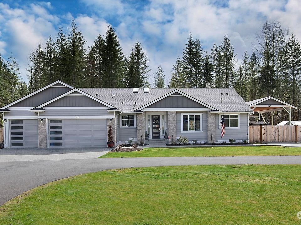Located in the luxury home community Enchantment, this 1-year-old 2,458 SqFt, 3br, 2bth + office, home w/3-car garage features open floor plan w/gas fireplace showcasing a gourmet kitchen w/top of the line appliances, high end cabinets, quartz countertops, and a generous island. Lrg primary suite features a retreat area to relax in spa style bath with modern flair. Work from home office AND enjoy the 1+ acre, level, fully fenced backyard bordering greenbelt. On top of all of that, there are $100K in additional upgrades including: a circular driveway, covered RV/Boat pad, a 1200 SqFt stamped concrete patio w/built-in fire pit + lighted gazebo, large shed, and custom see through rear fence that allows you to view all that nature has to offer.