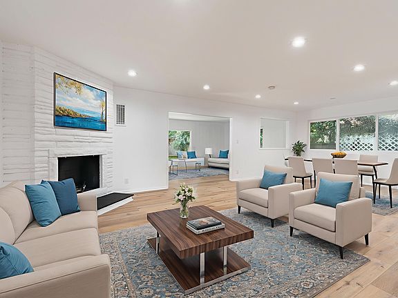 Beautifully remodeled ranch-style home featuring three spacious bedrooms and two updated bathrooms. Centrally located in a charming neighborhood, this residence offers a bright, open floor plan with expansive living and dining areas. The inviting living room showcases a brick corner fireplace, while the oversized den opens to the backyard through sliding glass doors. Enjoy a sunlit galley kitchen complete with a breakfast nook, newer shaker cabinets with soft-close hardware, quartz countertops, a subway tile backsplash, and a premium stainless steel appliance suite, including a range, microwave, dishwasher, and refrigerator. Adjacent to the kitchen, a cozy service porch offers flexibility as a small office space. All bedrooms are generously sized, and both bathrooms have been remodeled with modern quartz finishes and classic subway tile accents. The backyard features a covered patio and a meticulously maintained grassy lawn, perfect for outdoor relaxation. Additional highlights include vinyl plank flooring and recessed lighting throughout. This stunning property is a must-see!