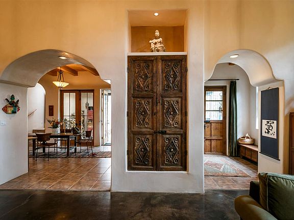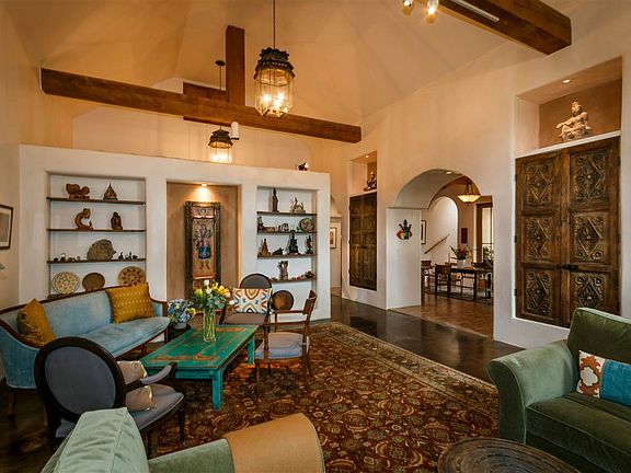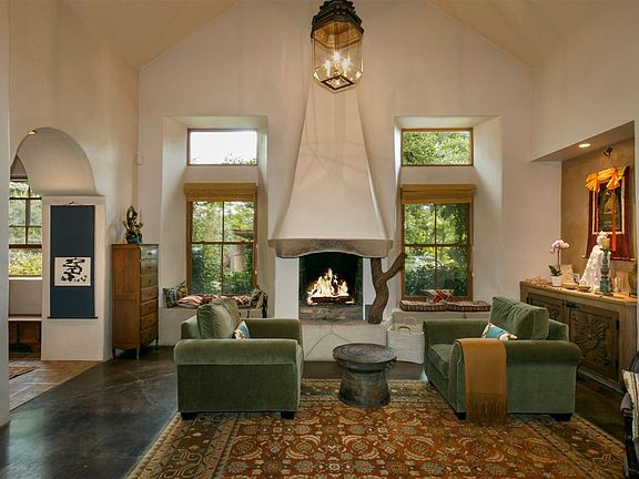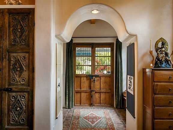 This intimate, lush compound offers an historic farmhouse-style residence and delightful pueblo-style guesthouse on a gated one-half acre lot. You'll feel like you're living the history, surrounded by mature flowers and trees, with outdoor views to the foothills and a glimpse of Sun and Moon Mountain. Legend has it that the main house was once the barn for the neighboring property, built of stone and adobe, and later that it was the headquarters for a pinto bean operation. With an addition, today it has been transformed into a charming home with a library, master bedroom wing with a pitched ceiling, kiva fireplace, sitting room, and a modern bathroom and spacious closet/dressing room. The upstairs guestroom with private bath floats in the clouds. The living room is magnificent with a grand fireplace and plastered walls. French doors open from the dining room to a covered portal and patio. The detached guesthouse has a living room with vigas, kiva fireplace and French doors. There is a full-service kitchen and private bedroom and bath. Just five minutes to the Santa Fe River and close to Canyon Road, you will enjoy the mantle of old Santa Fe living in this enviable property.