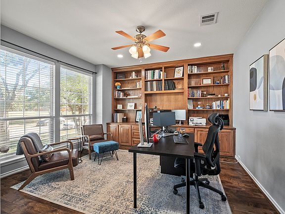 Inside, you’ll find an updated kitchen with granite countertops, generous living spaces, and an inviting office with custom built-in bookcases. The oversized primary suite on the main level offers a relaxing retreat, while the upstairs media room is ideal for movie nights or watching the big game.
