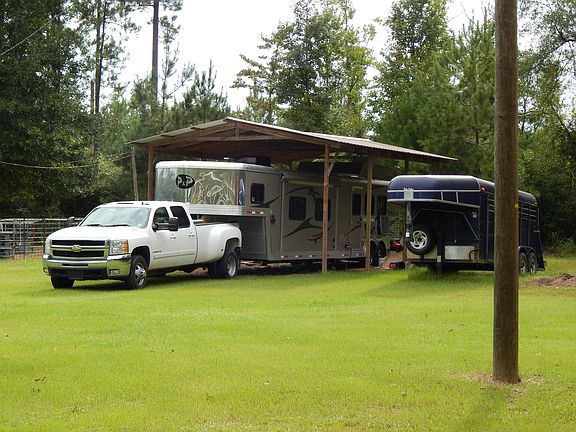 Large open floor plan w/ wrap around porch. Barn w/ 5 stalls for horse and tack room and hay loft. A covered building to store farm equipment as well as covered building to store RV w/ electric hook-up. Enclosed metal building for protected storage.