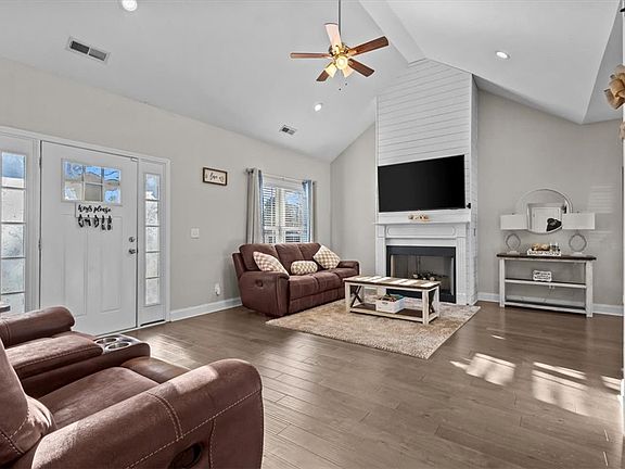 The open floor plan seamlessly connects the living, dining, and kitchen areas, providing an easy flow for daily life. The covered rocking chair front porch invites you to relax and enjoy the peaceful surroundings. Inside, the primary bedroom features his and hers walk-in closets and a large ensuite bathroom, giving plenty of space and privacy. The walk-in laundry room is very spacious and conveniently located just outside of the primary suite.