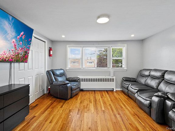 The second level offers a living room, a kitchen/dining area, two bedrooms, a full bathroom, and a linen closet.