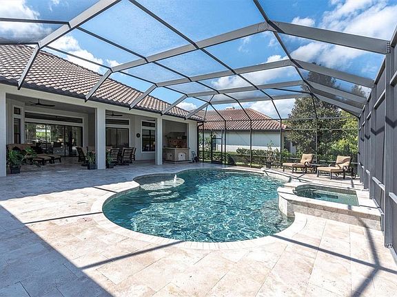 Luxury, Lifestyle, and Lasting Quality in Gated Ladera close to everything Tampa Bay has to offer and in the top school district in the area! Experience refined living in the prestigious gated community of Ladera on Lake Merrywater, a private enclave known for its grand estates, peaceful lake views, and serene setting. Stunning pool oasis in back, set on a beautifully landscaped half-acre corner lot, this 2015 custom-built home blends timeless design with modern comfort and thoughtful craftsmanship. From the moment you arrive, the tile roof, elegant stucco finish, and manicured curb appeal set the tone for what awaits inside. Step through the double-door entry into a grand foyer with 12-foot coffered ceilings, crown molding, and expansive open spaces that flow seamlessly between formal and casual areas. Every detail was carefully chosen and executed with care. The owners left no stone unturned, investing hundreds of thousands of dollars in custom finishes and luxury upgrades throughout. The gourmet kitchen is a showpiece featuring high-end granite countertops, double ovens, gas cooktop with pot filler, built-in microwave, and a prep sink in the large island, all complemented by solid wood cabinetry and a timeless color palette. Entertain with ease in the formal dining room, casual breakfast nook, or spacious family room designed for elegant yet relaxed Florida living. The primary suite, featuring a sliding door and pool views, provides a tranquil retreat with a spa-style bath, dual vanities, and expansive walk-in closets. Additional bedrooms include a Jack-and-Jill suite, a guest room, and a large bonus room with custom-built-ins that provides the perfect flex space for media, play, or an in-law suite with French doors leading to its own private covered lanai overlooking the pool. Enjoy the best of indoor-outdoor living in your private pool and spa surrounded by a travertine deck, sun shelf, fountains, and a screened lanai with two covered lounging areas. The outdoor kitchen is fully equipped with a gas grill, vent hood, side burners, granite counters, bar area, and a beverage fridge, perfect for entertaining year-round. Additional highlights include a Generac whole-home generator, gas tankless water heater, water softener, new interior and exterior paint, new plush luxury carpeting in bedrooms, two new A/C units, exterior landscape lighting, gutters, and a fully fenced backyard. The three-car garage features a finished floor, ample storage, and gas and electric connections in the finished laundry room, which includes a large folding counter and extensive cabinetry. Ladera offers a rare sense of tranquility with no CDD fees, a community dock for fishing and kayaking, and walking paths along the lake. Ideally located near top-rated schools, shopping, and dining with easy access to major highways, this home offers the perfect blend of luxury and convenience. 1403 Merry Water Drive is more than a home; it is a statement of craftsmanship, care, and comfort, designed for those who appreciate the finer things in life. Zoned for Steinbrenner High School, Buchanan Middle School, and Lutz Elementary. Shopping, medical, beaches, close by! No CDD. Hurricane shutters included. This home was unaffected by any hurricanes in the area. For more information, bit.ly/1403MerryWater