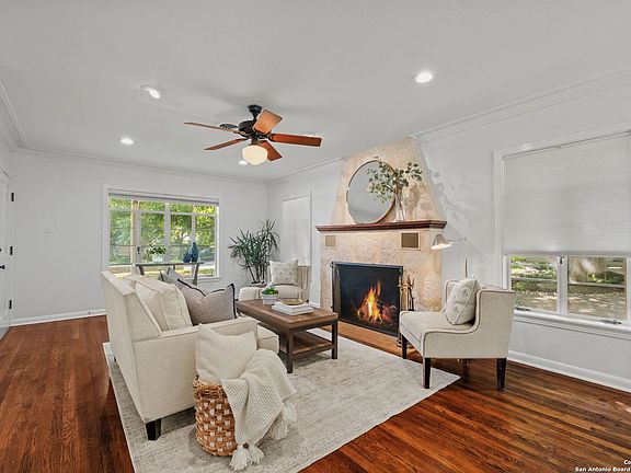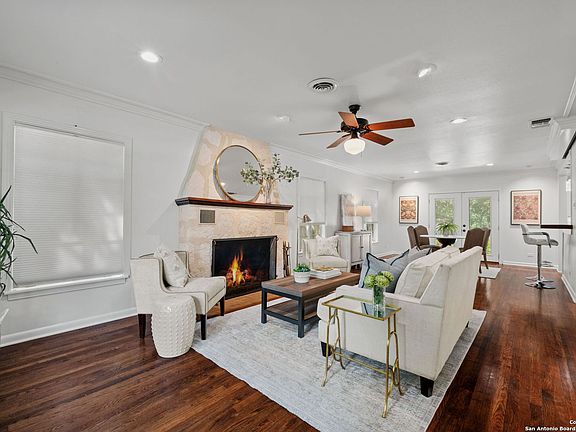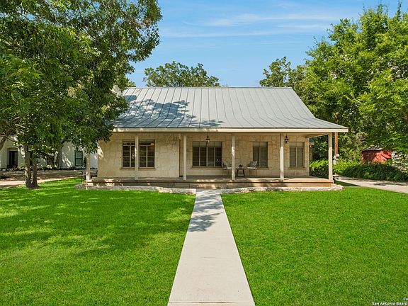 Riverside Mid-Century Retreat in Castroville. Experience timeless charm in this recently renovated mid-century stone cottage, perfectly positioned on .72 acres with 75 feet of serene Medina River frontage. Whether you're kayaking from your backyard or relaxing beneath the canopy of majestic bald cypress and pecan trees, this property offers a rare blend of privacy, nature, and convenience.,A wide front porch welcomes you into the home, while multiple patios extend your living space outdoors-including a breathtaking riverfront patio surrounded by lush liriope that bursts into purple blooms each year. Inside, the light-filled living area features a striking stone fireplace with gas logs, a cozy dining nook, and a spacious chef's kitchen complete with a custom bar, pendant lighting, and countertops crafted from century-old barn wood. French doors frame vibrant views of the property, while refinished dark hardwood floors provide a rich contrast to the bright, airy interiors. Three generously sized bedrooms share an oversized bath with a walk-in shower and convenient washer/dryer closet, creating a comfortable and functional layout. Additional features include a detached two-car garage with a secondary utility room, a private well for irrigation, and recent extensive updates. Just a short walk from historic Castroville's charming shops, wine bars, and community park-and only a 25-minute drive to San Antonio-this riverfront retreat perfectly balances small-town charm with modern convenience.