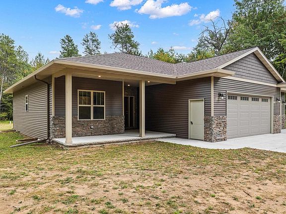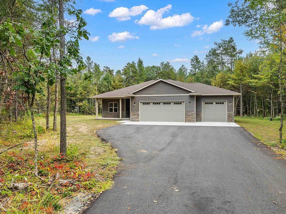Contemporary 1 story, 3-bedroom, 2 full bath executive ranch with a 3-car attached garage nestled into a wooded 1.34-acre lot, close to Stevens Point. This home features an open concept design with 9-foot vaulted ceilings, gas/log fireplace, hand peeled red oak 3/4 hardwood floors in the living room, dining area, hallway and bedrooms. Ceramic tile in the laundry and bathrooms. Kitchen features Quartz countertops, high end cabinetry with soft close drawers, ceramic backsplash, under cabinet lighting and plenty of storage as well as a walk-in-pantry. The large primary bedroom has a walk-in closet with hanger racks and shelves and the primary bedroom bath features a tiled walk-in shower and bathtub. Finishes includes high end doors, fixtures, cabinetry, trim and a gas log fireplace finished with stone. This home also offers the latest technology in heating and cooling, a thermostat that can be controlled from your smart phon, zoned heating between the main floor and LL and a power vented water heater. The exterior features vinyl siding with stone trim and a stamped concrete patio.,This new construction is ready to move into!! Seller is offering install of a complete soft water system of $2500 with any offer received before October 31, 2025. There is an option to finish the LL that includes drywalling and flooring for a family room 16x28 with an egress window, 4th bedroom 10x12 with egress window and 3rd full bath 8x9 with walk-in shower or tub and ceramic tile for an additional $45,000. This comes to an additional 1,088 of finished sq ft. The HVAC is designed for a full 2,835 sq ft and the septic is designed for a 4 bedroom home. There is also an option to add underground sprinklers prior to finishing and that price is to be determined.