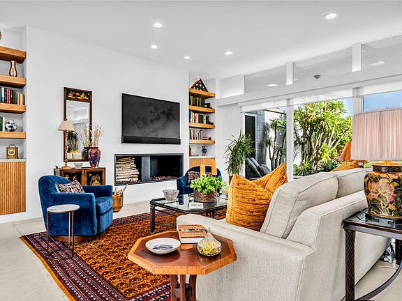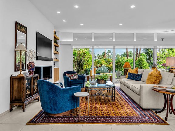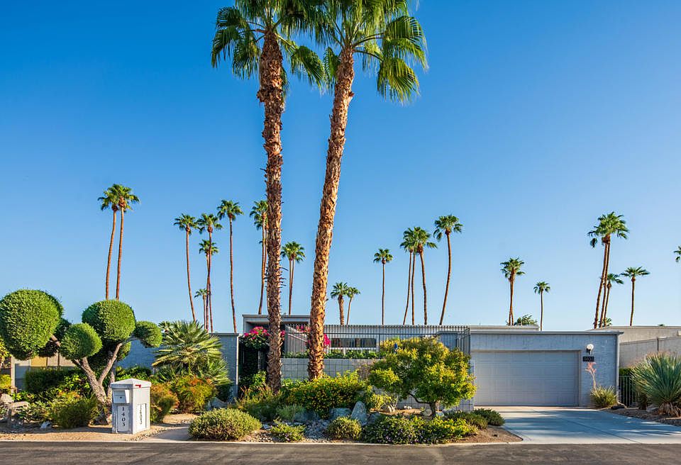 Welcome to 1403 Tamarisk West Street, a mid-century modern residence by the legendary architect S. Charles Lee, whose iconic Hollywood theaters helped define California's architectural legacy. This 2-bedroom, 2-bath home offers 2,376 square feet of light-filled living space, thoughtfully updated to preserve its original character while incorporating modern comforts.From the moment you step through the bold entry door, you're greeted by high ceilings, expansive glass walls, custom motorized shades and panoramic views of lush landscaping and the sparkling community pool. The Great Room features multiple sitting areas, a double-sided slate fireplace, built-in bookcases and a wet bar. The seamless indoor-outdoor flow is ideal for entertaining.The updated kitchen features sleek cabinetry, granite countertops, a glass tile backsplash, and newer stainless-steel appliances. A small private paver patio with a built-in BBQ completes the separate dinette area. Both oversized bedroom suites offer updated bathrooms with spa inspired walk-in showers and walk-in closets. The primary suite bathroom also has a free-standing soaking tub.Energy-efficient upgrades include leased solar panels, two HVAC systems, recessed LED lighting and a tankless water heater. The home sits on a 4,792 sq ft lot with a private front courtyard with southern mountain views. The backyard includes a covered patio complete with ceiling fans and a beautiful view of the community pool and surrounding lush landscaping.Located in the prestigious Tamarisk West community with direct access to Tamarisk Country Club, this home is minutes from the Agua Caliente Casino, The River, El Paseo, Sunnyland's, and the Palm Springs International Airport. Whether you're seeking a seasonal retreat or a full-time residence this home delivers sophistication and serenity with a convenient location.