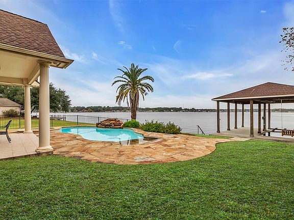Luxurious waterfront living awaits in this beautifully crafted residence showcasing breathtaking panoramic lake views and exceptional outdoor amenities. Designed for refined lakeside living, this home features a sparkling pool, expansive covered patio, and a private boathouse with boat lift—perfect for effortless days on the water. Inside, the open-concept layout is enhanced by elegant finishes and walls of windows that frame the serene views from the living area, gourmet kitchen, breakfast room, and primary suite. Impeccably maintained and thoughtfully designed for both grand entertaining and everyday comfort, this home offers a rare blend of sophistication, relaxation, and the ultimate lakefront lifestyle.