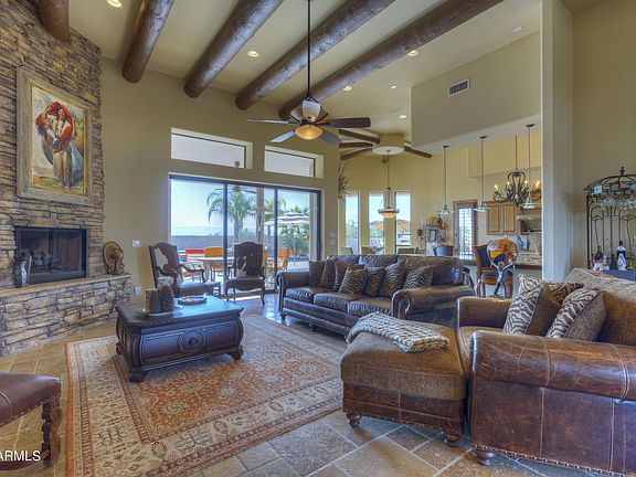 A special gem for the discerning buyer: Highly upgraded custom-built home on 2 acres. The home exudes warmth and luxury created by a combination of details such as matching travertine floors inside and outdoors, wooden beams, faux rock fireplaces and walls, granite, skylights, high ceilings & curbed walls. Indoor / outdoor living at its best: Step into the open family room which can be opened up to the lavish backyard by sliding glass doors that vanish into the walls. California Pools built the outdoor Oasis only 2 years ago, featuring a luxurious pool with spa & water features, outdoor kitchen, palm trees, outdoor shower, etc. Enjoy ultimate privacy and gorgeous views of various mountain ranges from the backyard. The home also features a gourmet kitchen w/ alder-wood ...